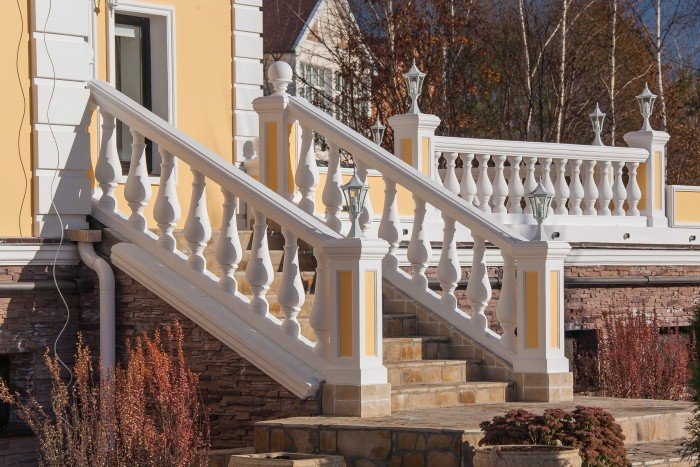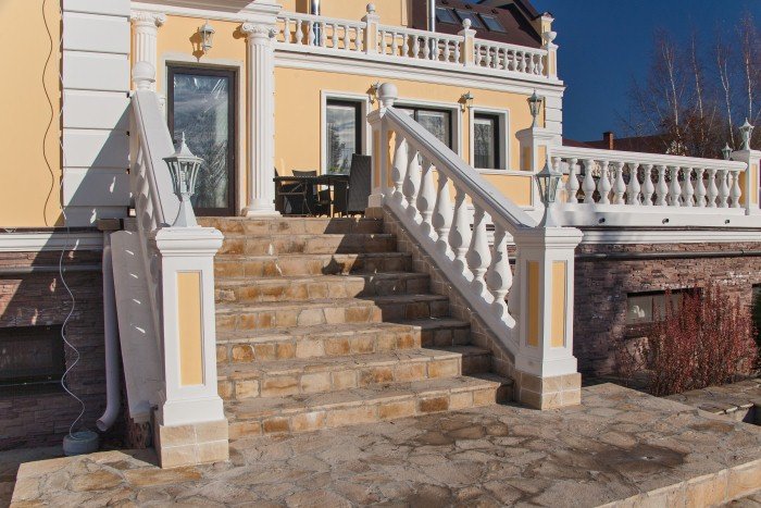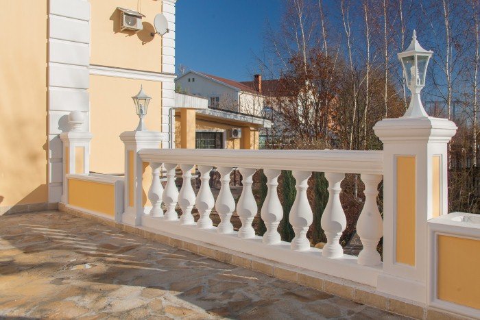 На этом объекте мы установили балюстраду из архитектурного бетона и навершие в виде балюстрадного шара, обустроили цветочники.