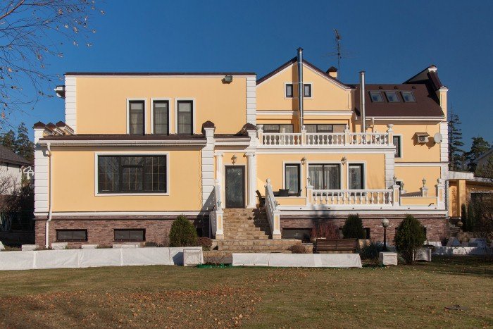 Фасад дома декорирован межэтажным и цокольным поясами, рустовым камнем.