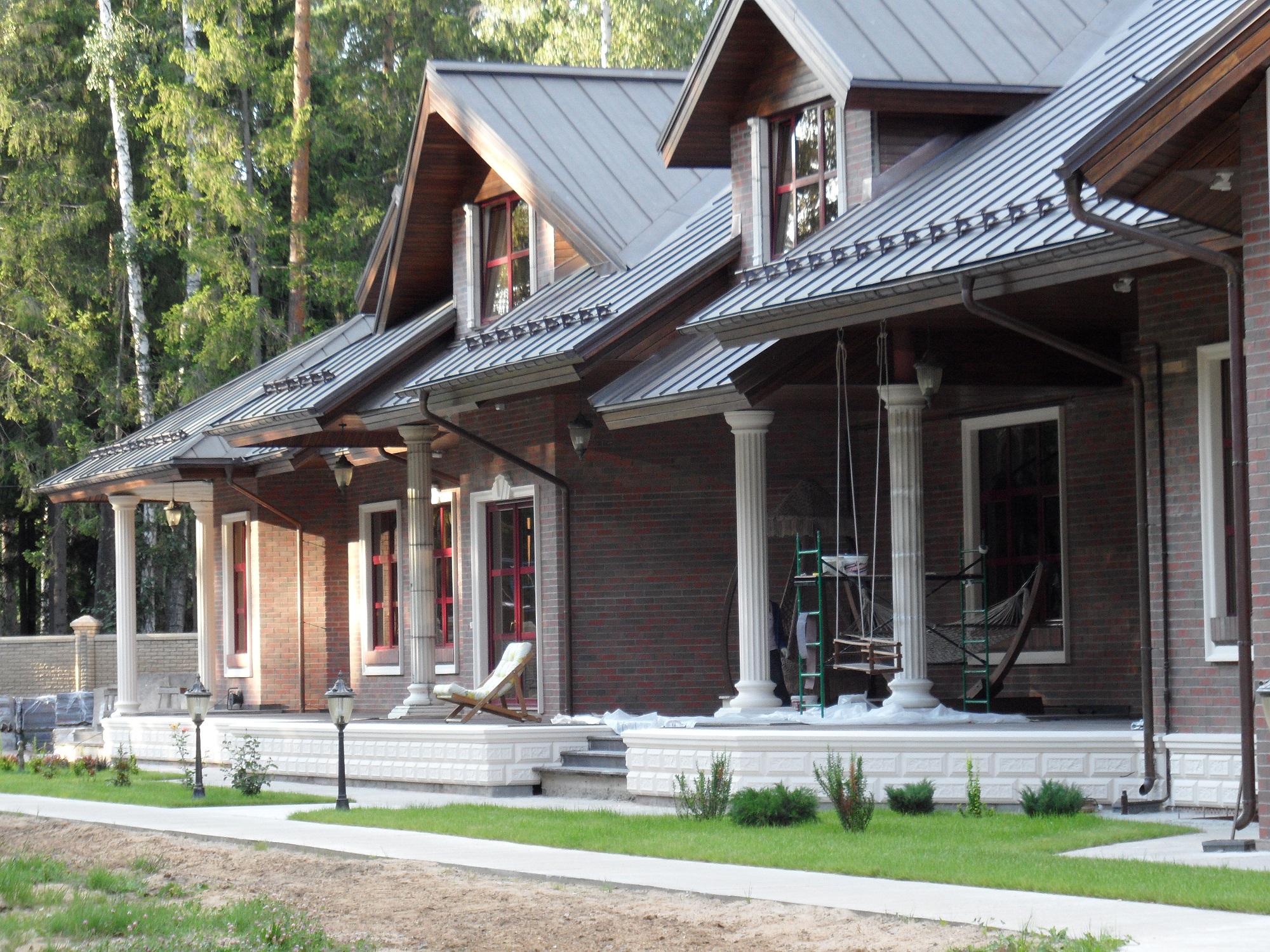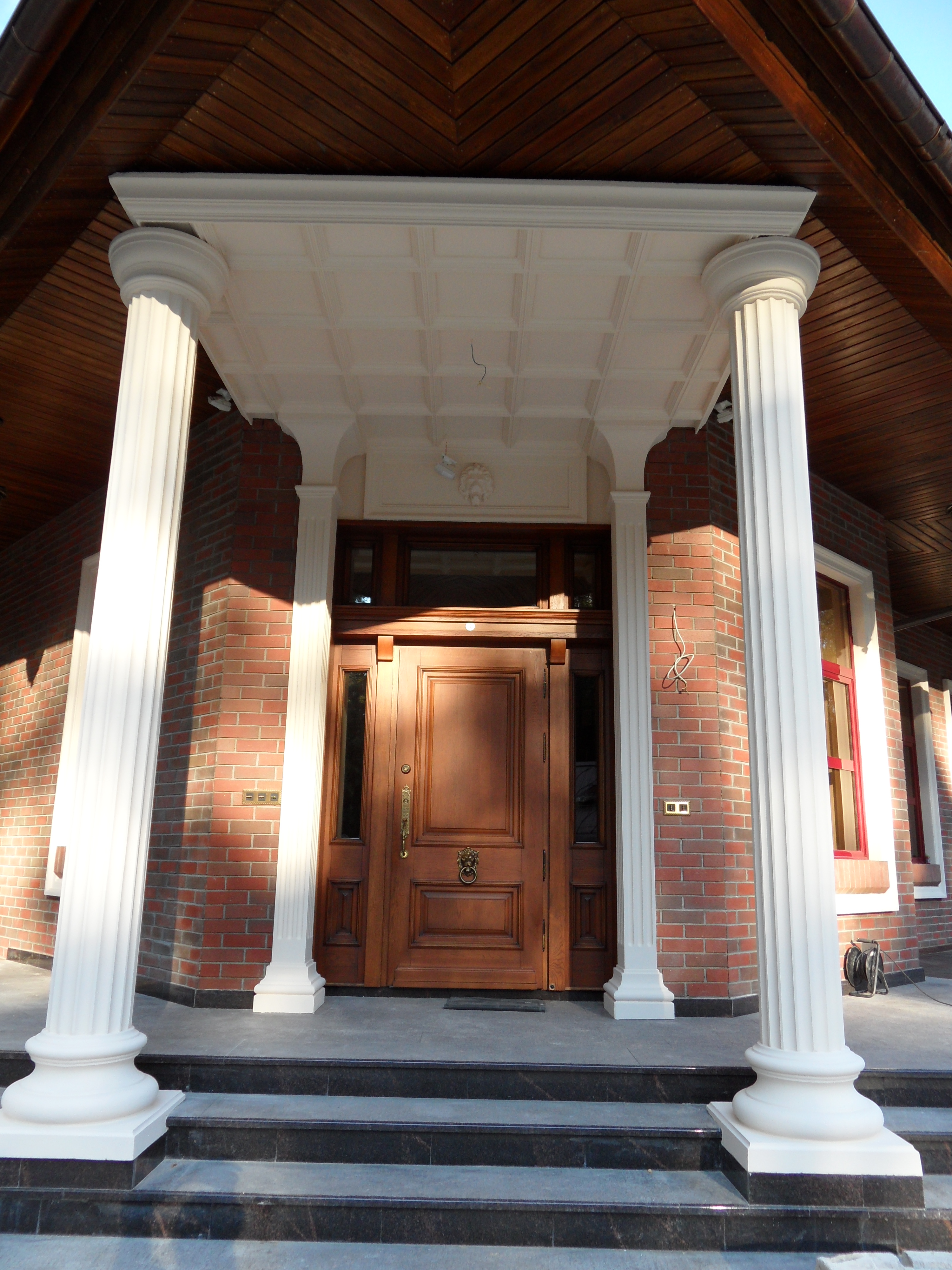 При обустройстве экстерьера загородного дома была оформлена входная группа с использованием колонн с каннелюрами, пилястр с дорическими капителями.