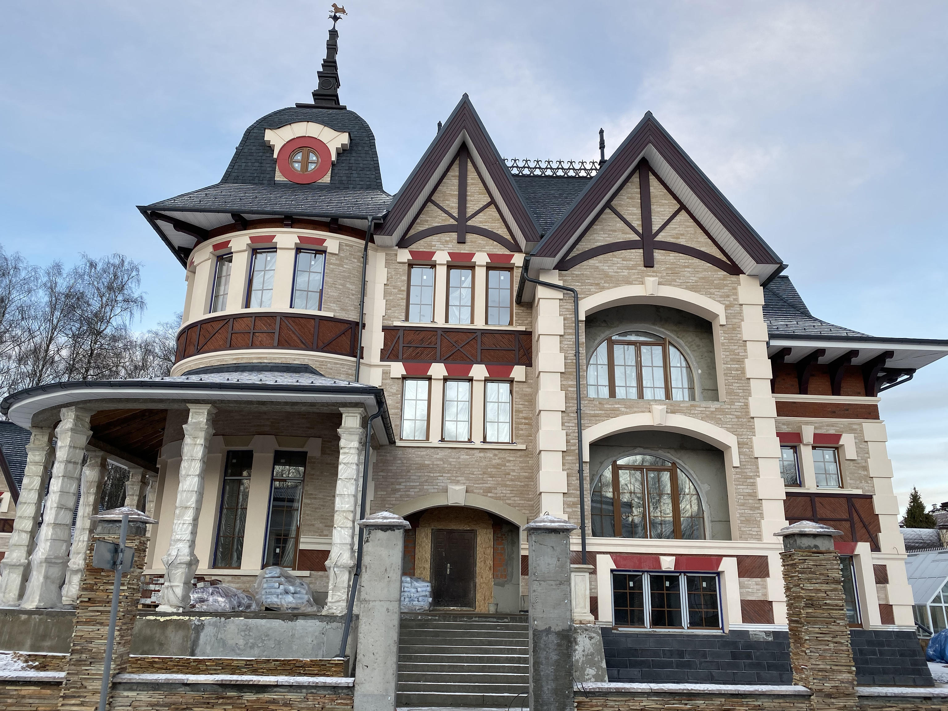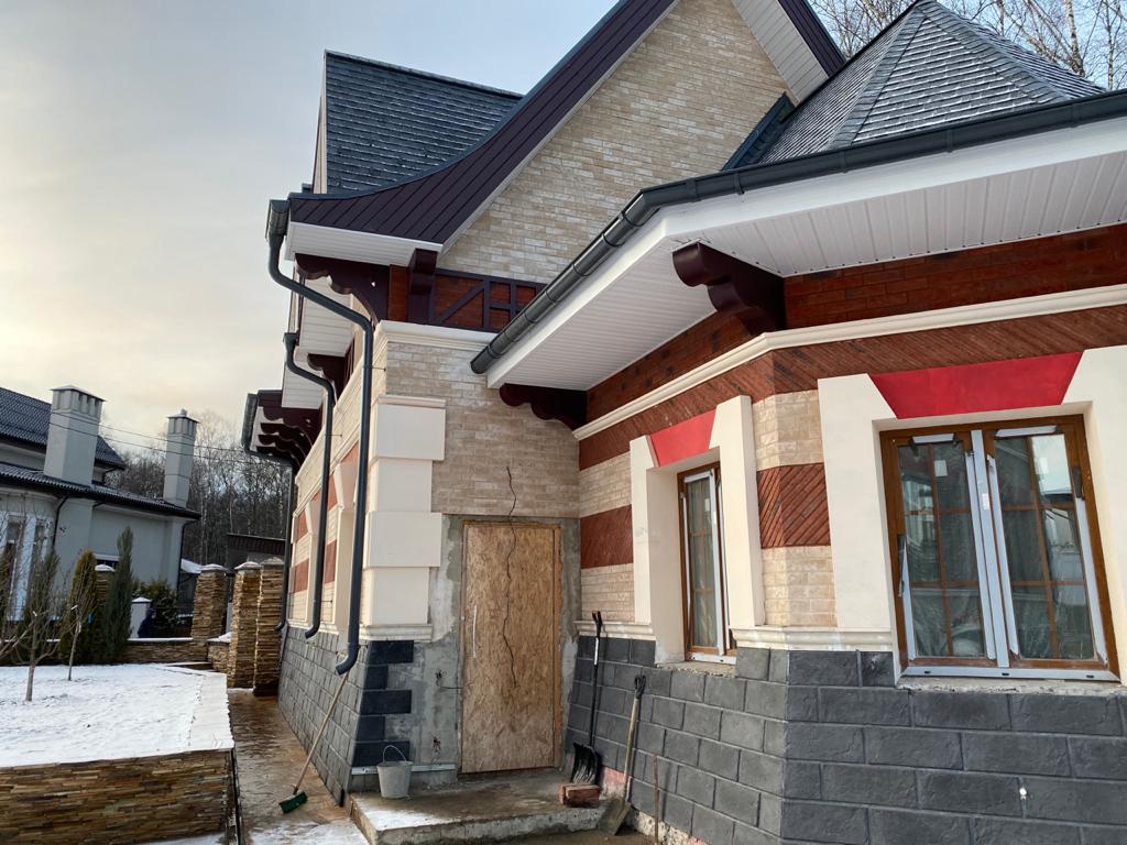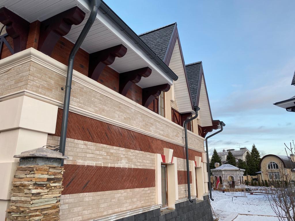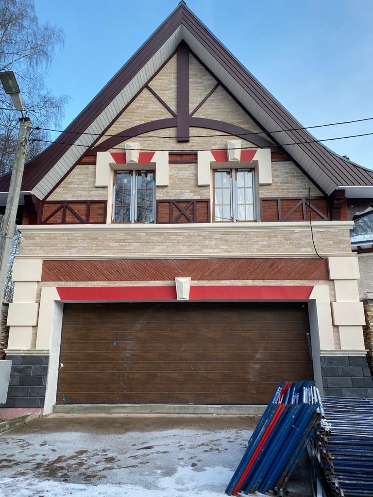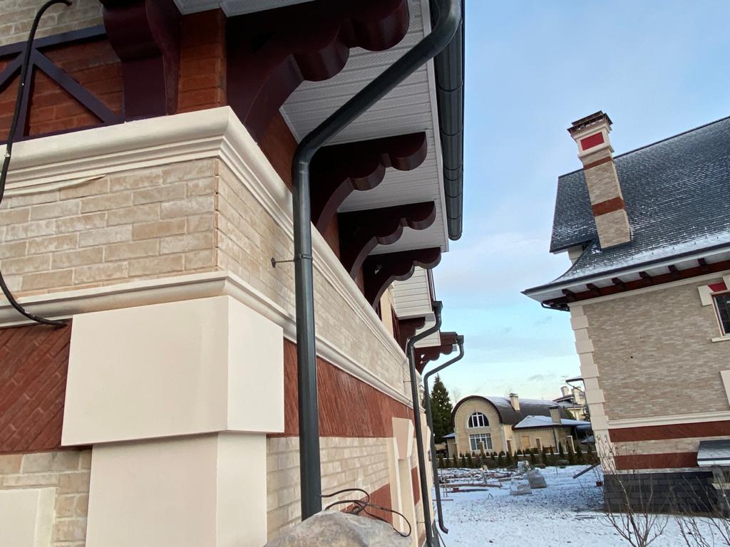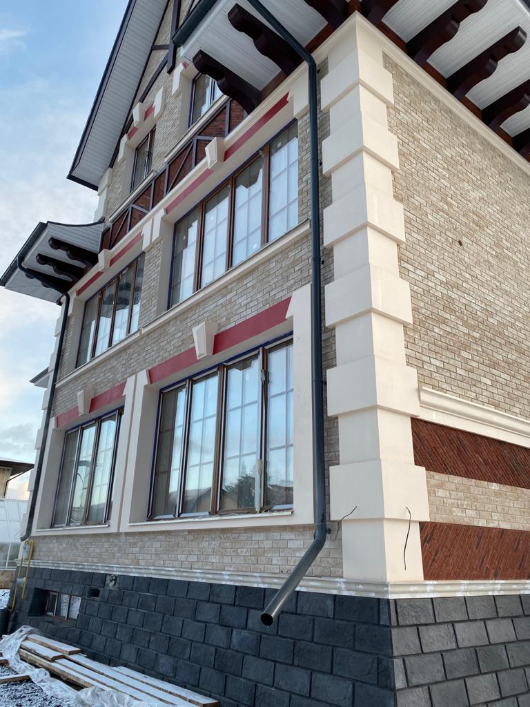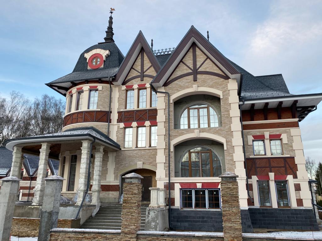 На данном объекте установлены детали из полимер-мрамора. Оконные проемы оформлены наличниками, кокошником, замковым камнем. Фасад украшен межэтажным поясом, рустовым камнем, венчающим карнизом и консолями. Фахверки прямые и радиусные, дымоход оформлен карнизом.