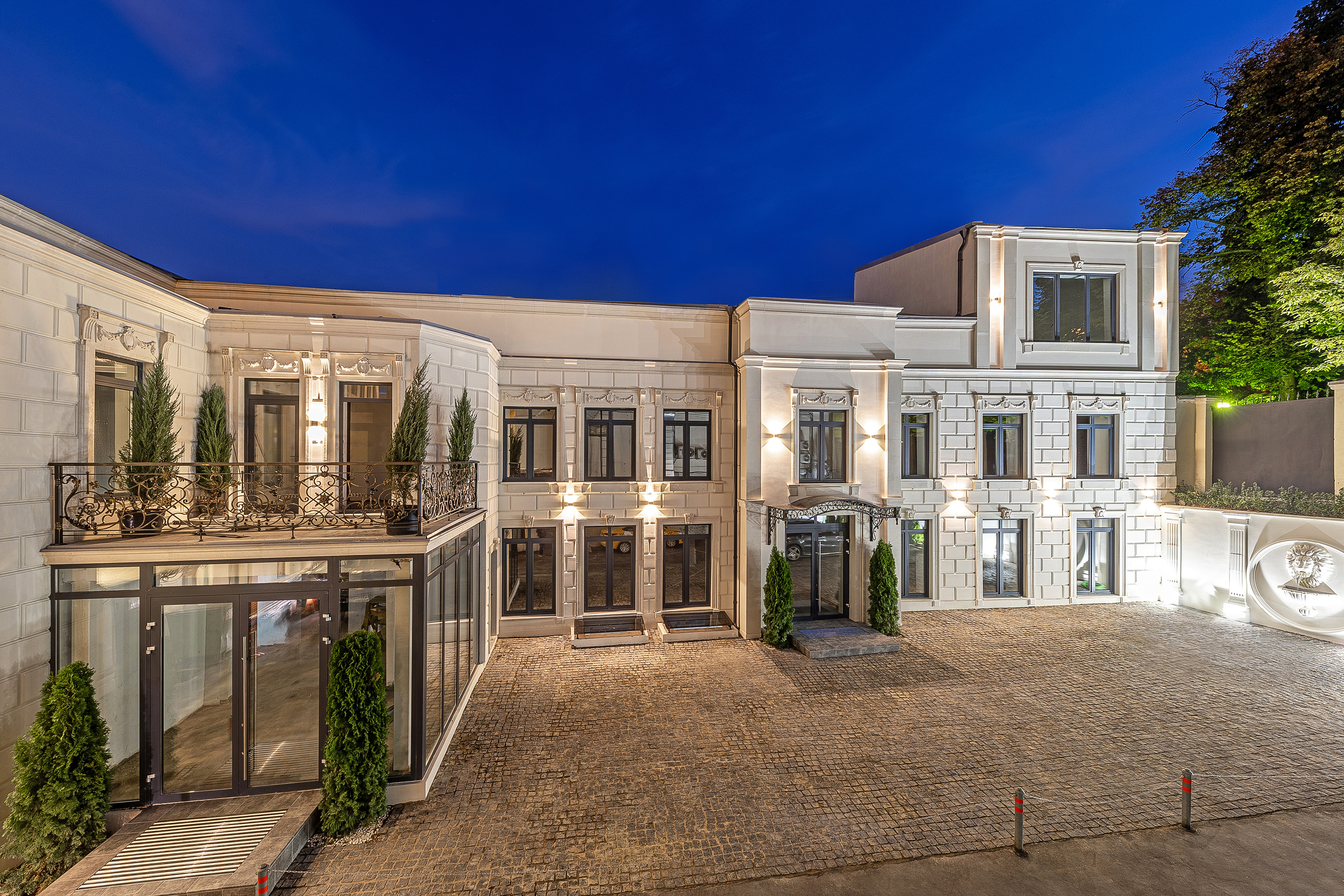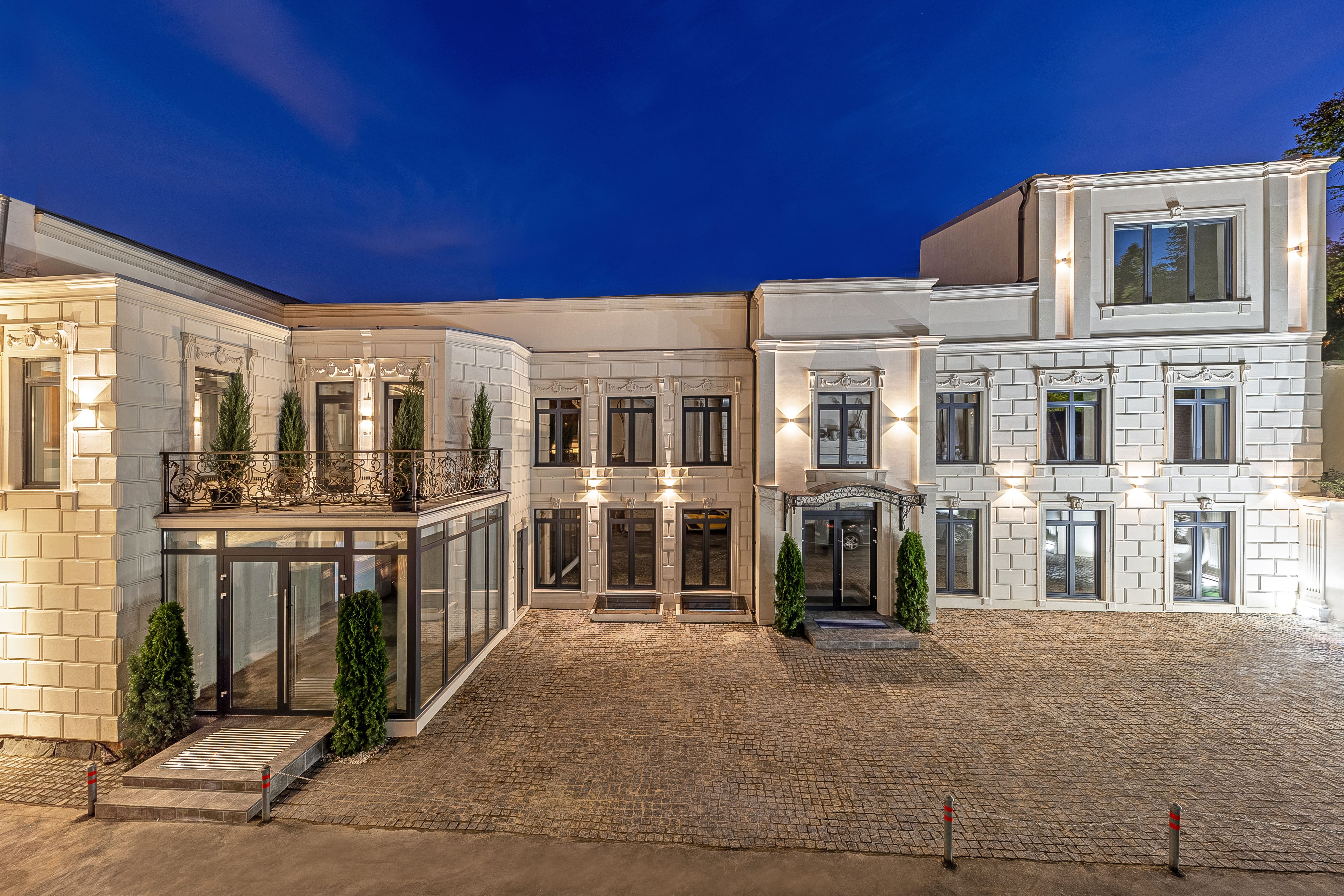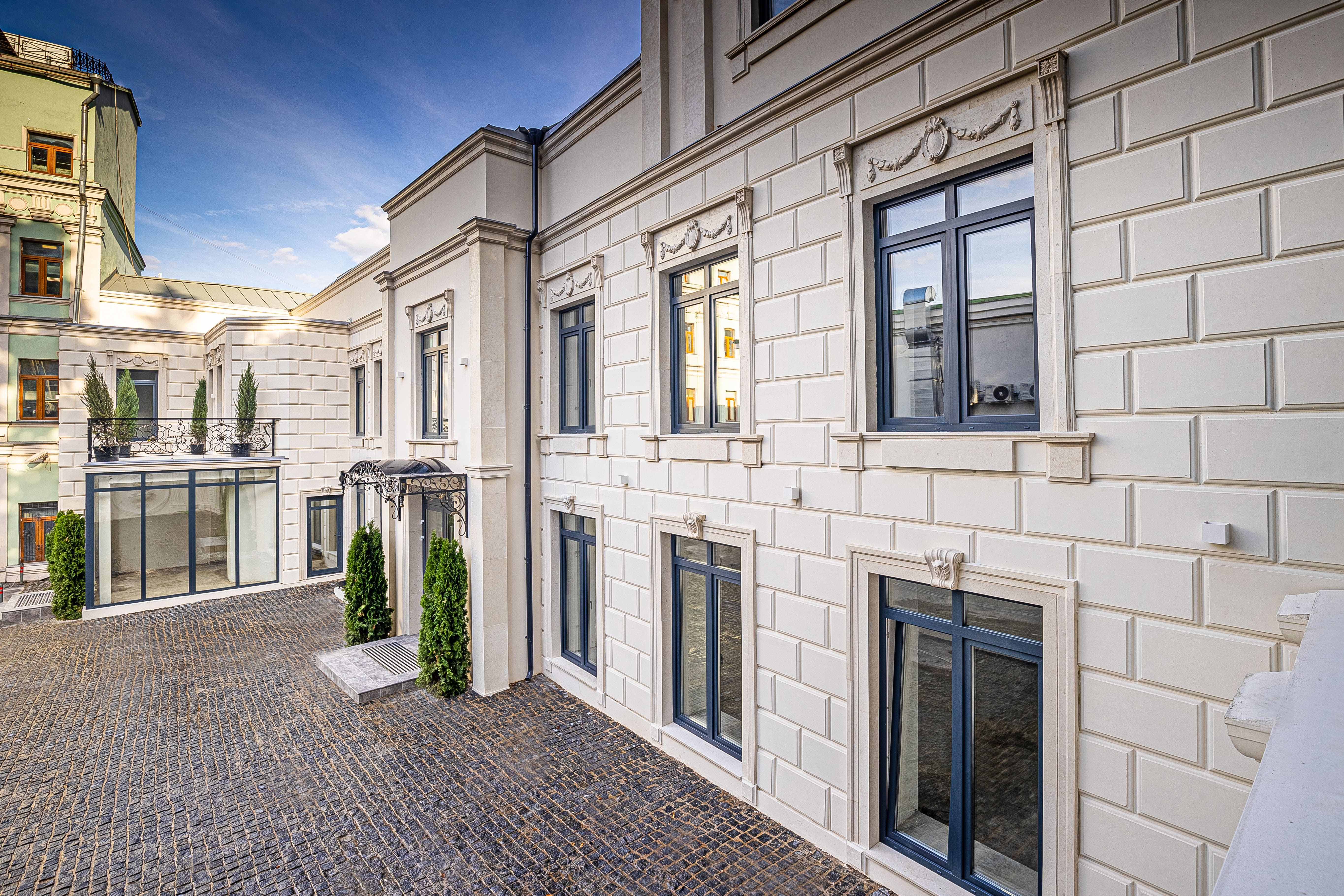 На этом объекте применены детали из полимер-мрамора: оконные и дверные проемы обрамляет оконный наличник и кронштейн, над окнами расположены филенки с изображением гирлянд.