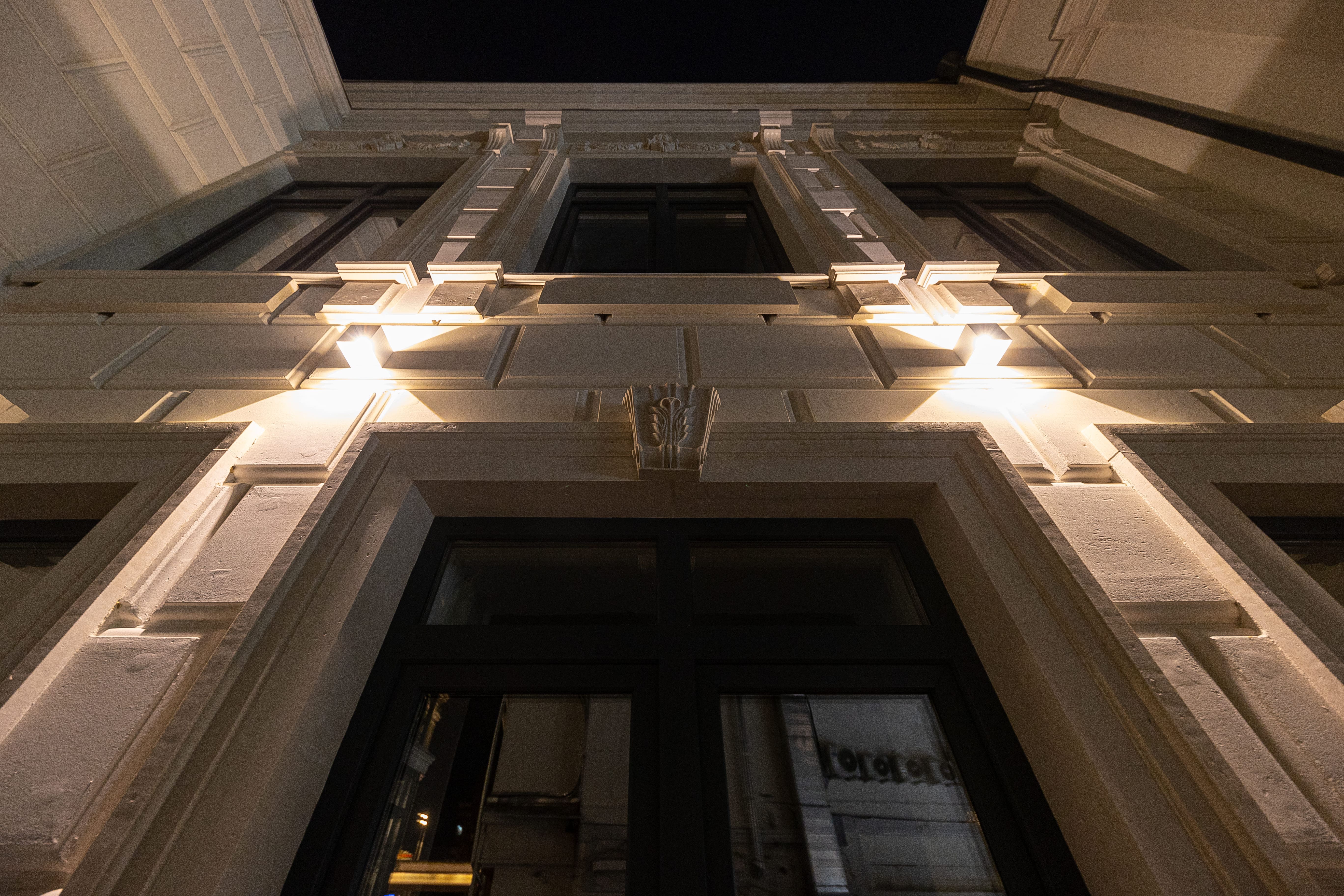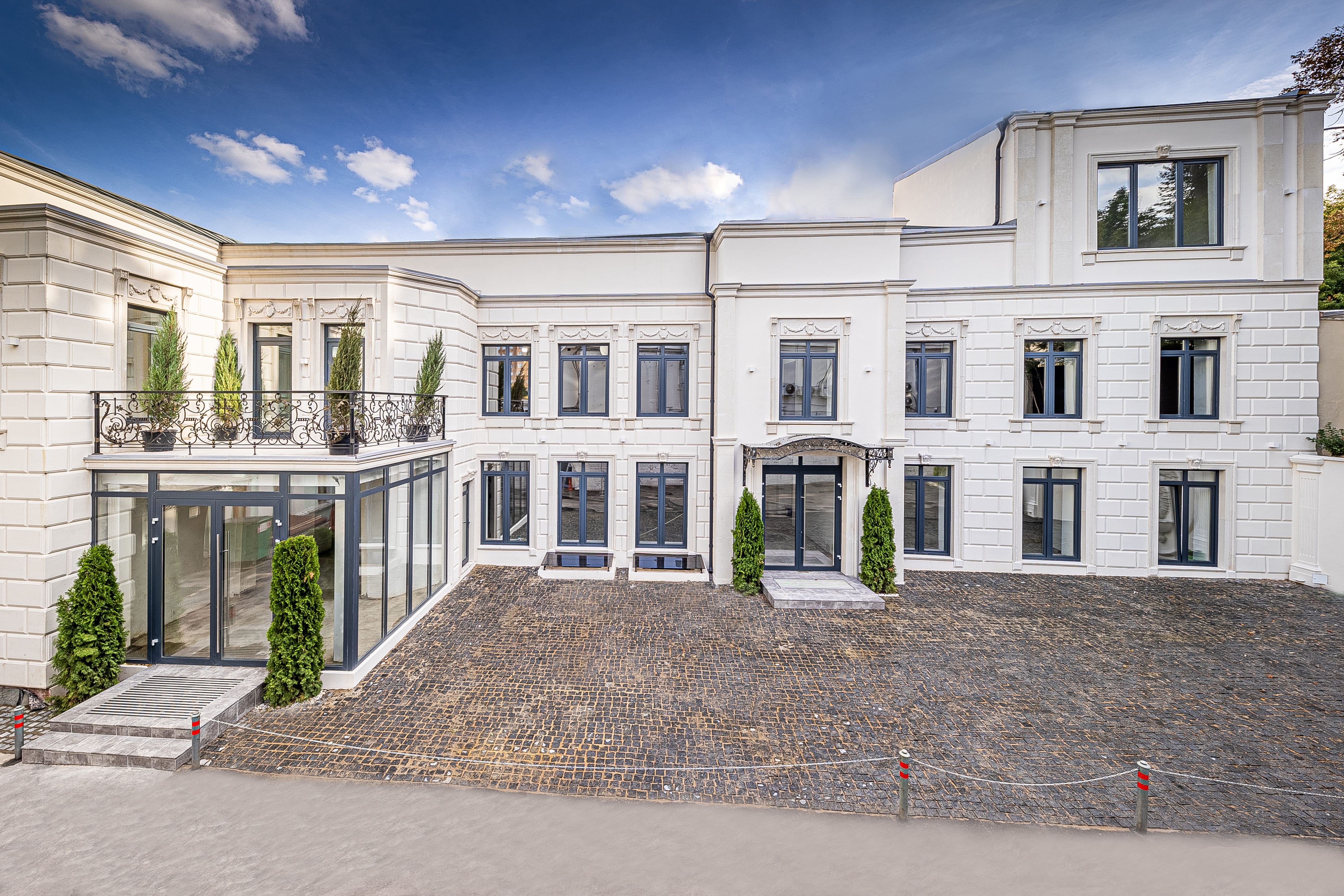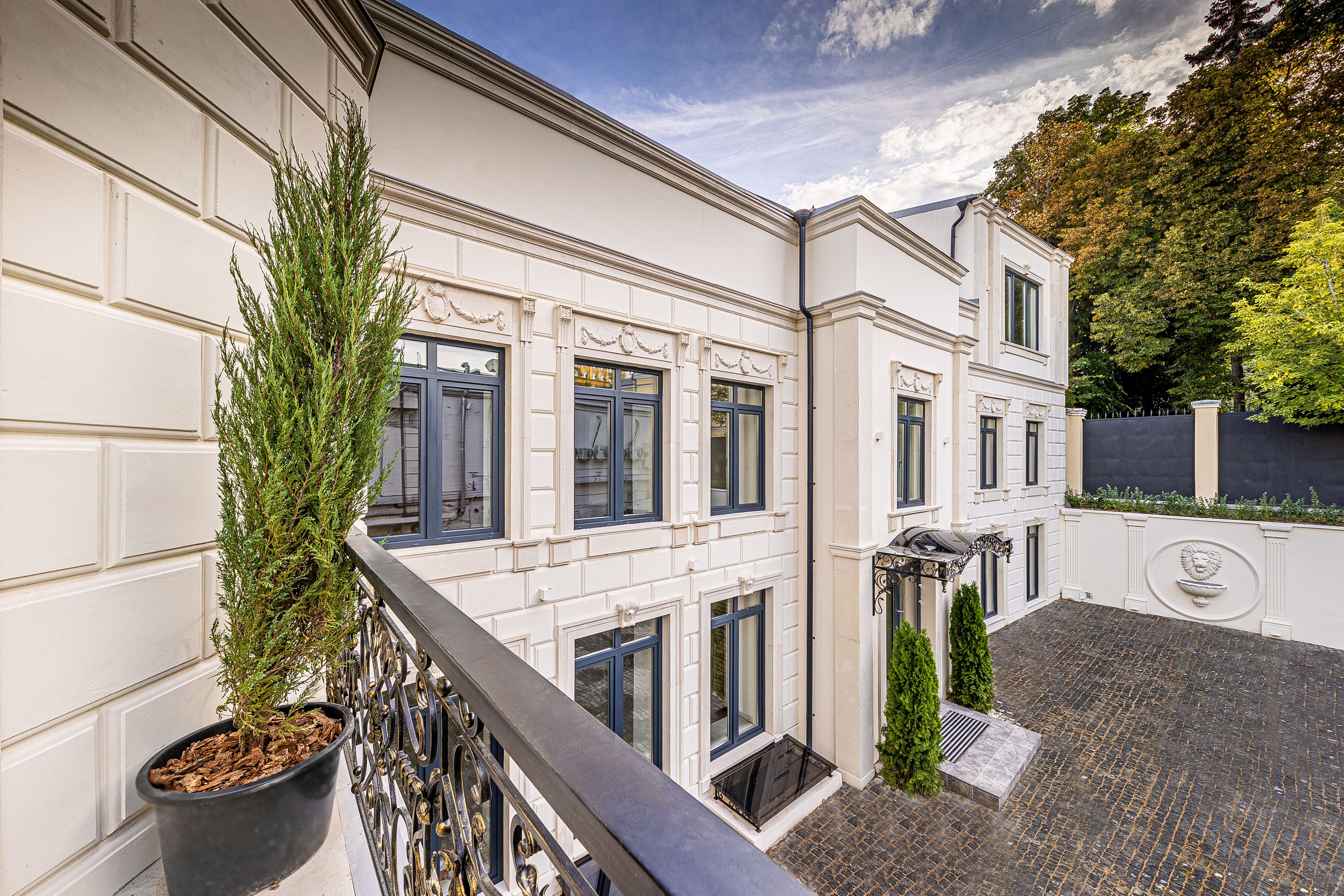 На этом объекте применены детали из полимер-мрамора: оконные и дверные проемы обрамляет оконный наличник и кронштейн, над окнами расположены филенки с изображением гирлянд.