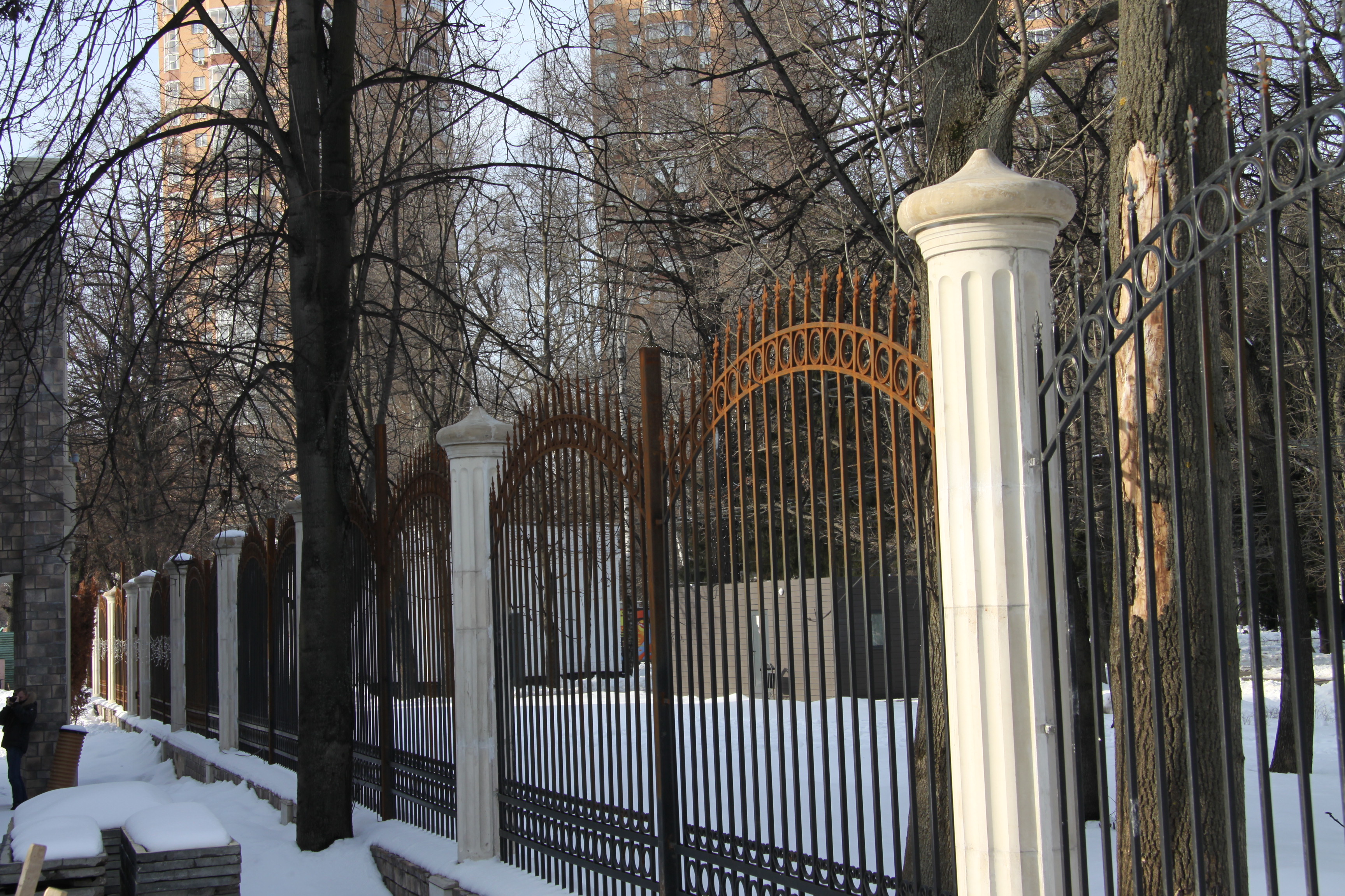 Установлены колонны с ионическими капителями, межэтажный и венчающий карнизы, пилястры на тумбах, декоративные розетки. Выполнена облицовка заборных столбов и заборные крышки.
